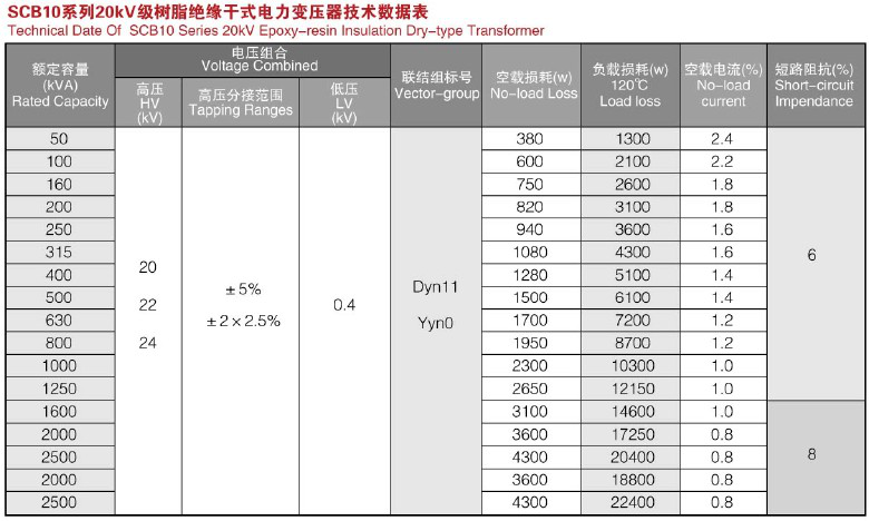 20kv級SCB10系列環氧樹脂干式變壓器技術參數: