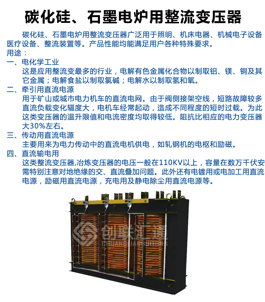 碳化硅、石墨電爐用整流變壓器廣泛用于照明、機床電器、機械電子設備、醫療設備、整流裝置等。產品性能均能滿足用戶各種特殊要求。